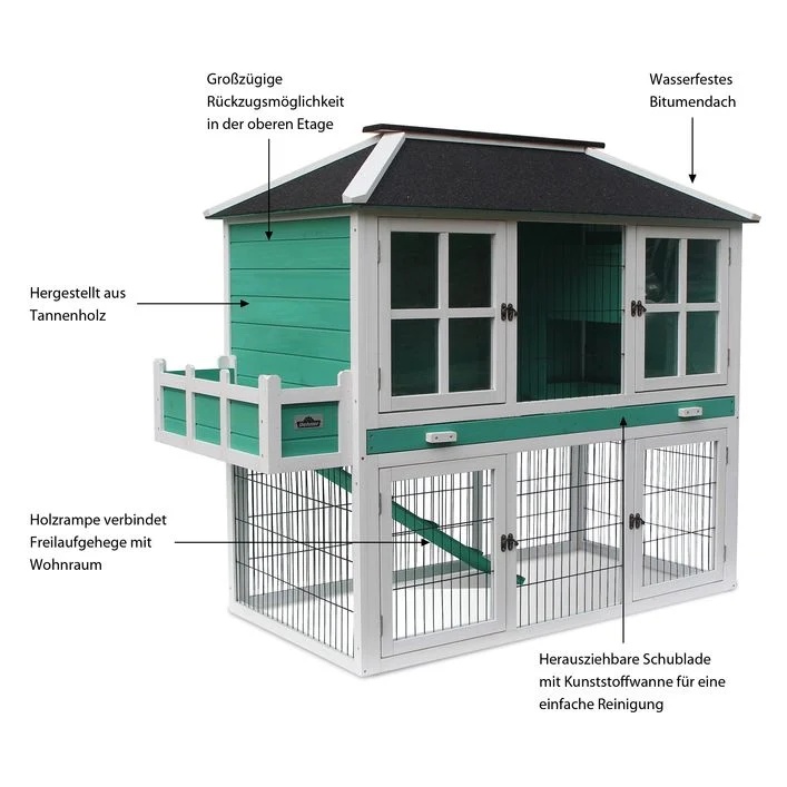 Thanks to its waterproof and sturdy bitumen roof, the attractive Dehner Lieblinge Nagerheim Palazzo reliably protects your rabbits, their food, and their accessories. At the same time, the robust bars and the solid, eco-friendly varnished fir wood ensure the necessary stability on any surface. This turquoise and white rabbit and hare hutch also looks impressive, with its compact, authentic palace shape and harmonious details. For example, the contemporary Dehner Lieblinge Nagerheim Happy Home Palazzo features a decorative flower box that you can fill with your own flowers and metal hinges . It quickly becomes clear that this modern small animal home is a genuine quality product !