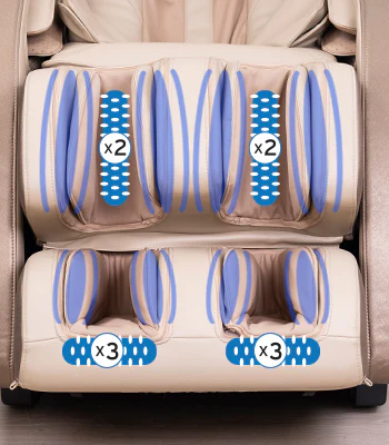 Each leg unit contains two rollers to soothe sore. tired calf muscles. The rollers imitate human hands gently working to relieve tension and pain and restore circulation and flexibility. The calf airbags simultaneously use an oscillating motion for added relief.