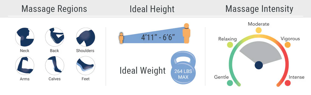 Zero gravity positioning elevates your knees above your heart. which allows the spine to decompress. provides a sense of weightlessness. and maximizes the effects of the massage rollers.
