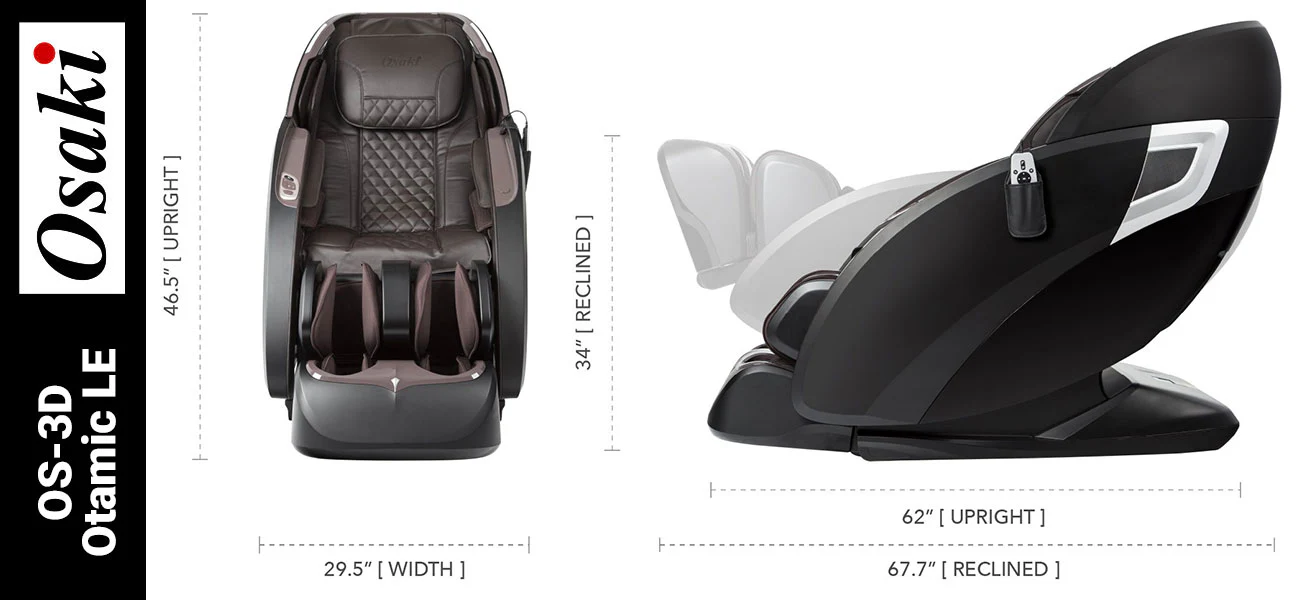 Osaki 3D Otamic LE is a 3D-adjustable massage chair with a 53 inch SL-track rolling system. Unlike other 3D Massage chairs. The Otamic LE is exclusively engineered with the latest massage chair features including Japanese Brushless Motors. which make it one of the smoothest. quietest. and most reliable massage experiences available. The chair also comes standard with Osaki's tri-core processor for faster response. transition. and reliability. The Otamic LE also offers an automatic footrest extension with heating in the footrest included.