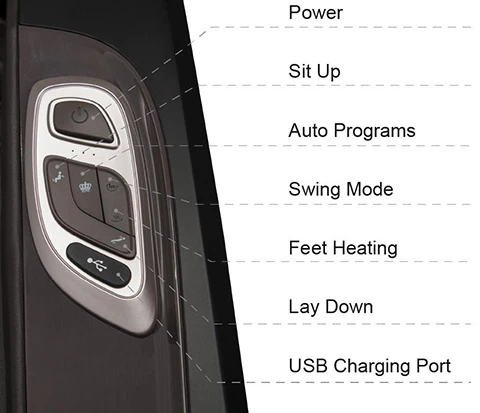 Side panel controller is designed that the user can easily control the chair without using a remote controller. The user can adjusting reclining position. Zero Gravity. Auto massage program. Heating ON/ OFF and USB connection.