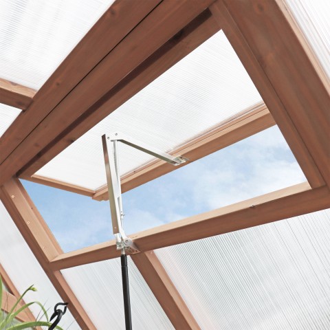 Double-wall polycarbonate windows are strong. durable and provide better insulation over single-wall polycarbonate and deliver superior UV properties and resistance from fading. 6' High Sidewalls provide room height. increasing light and air volume for healthy plant growth. The extra height allows customers to double up shelves and maximize the interior space. Tongue and groove style 32” high cedar base walls add a premium aesthetic and allows for storage of gardening tools that are out of sight from the exterior. The walls also provide protection from rock-shooting lawn mowers. Louvered base wall vent that is necessary for optimum air intake and plant health. Heat sensitive. automatic roof vent opener maintains temperature and humidity. Cedar door includes door latch and closer with quick-hold feature to keep door open. 16” wide lower shelf and 8” wide upper shelf surrounding 2 sides of the interior. 100% FSC certified cedar lumber finished in a Mocha brown stain color.